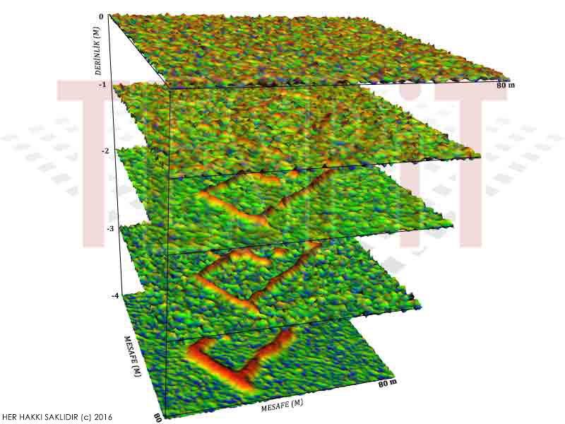 Tespit Mühendislik olarak gerçekleştirdiğimiz ve gömülü arkeolojik değerlerin bulunmasına yönelik arkeo-jeofizik / arkeometre çalışmalarında 2 boyutlu enkesitler ile ifade edilen klasik analizlerin yanısıra 3 boyutlu (3D) yer haritaları ve bunlara bağlı yere paralel enkesitler kullanmaktayız. Yeriçinin 3 boyutlu ve interaktif olarak yüksek çözünürlük ile incelenmesini sağlayan bu yaklaşımımız sayesinde arkeolojik kazılar daha sağlıklı bir şekilde planlanabilmekte ve proje alanlarında gömülü tarihi yapı ve eserlere çok daha hızlı ve net bir şekilde "nokta atışı" ile ulaşmak mümkün olmaktadır. Tüm bu çalışmalar en son teknolojik ekipmanlarla açık ve kapalı alanlarda dünya standartlarında gerçekleştirilmektedir.